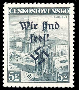 VF NH. Sep. 1938 60h. Stefanik commemorative stamp overprinted to welcome German rule. Germany was given the Sudetenland by England and France in an attempt to avoid war. Overprinted with "Wir Sind Frei and Swastika. <br>