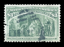 VF-XF used. 1893 green $3 Christopher Columbus describing his third voyage to the Spanish court. Moderate parcel cancel.